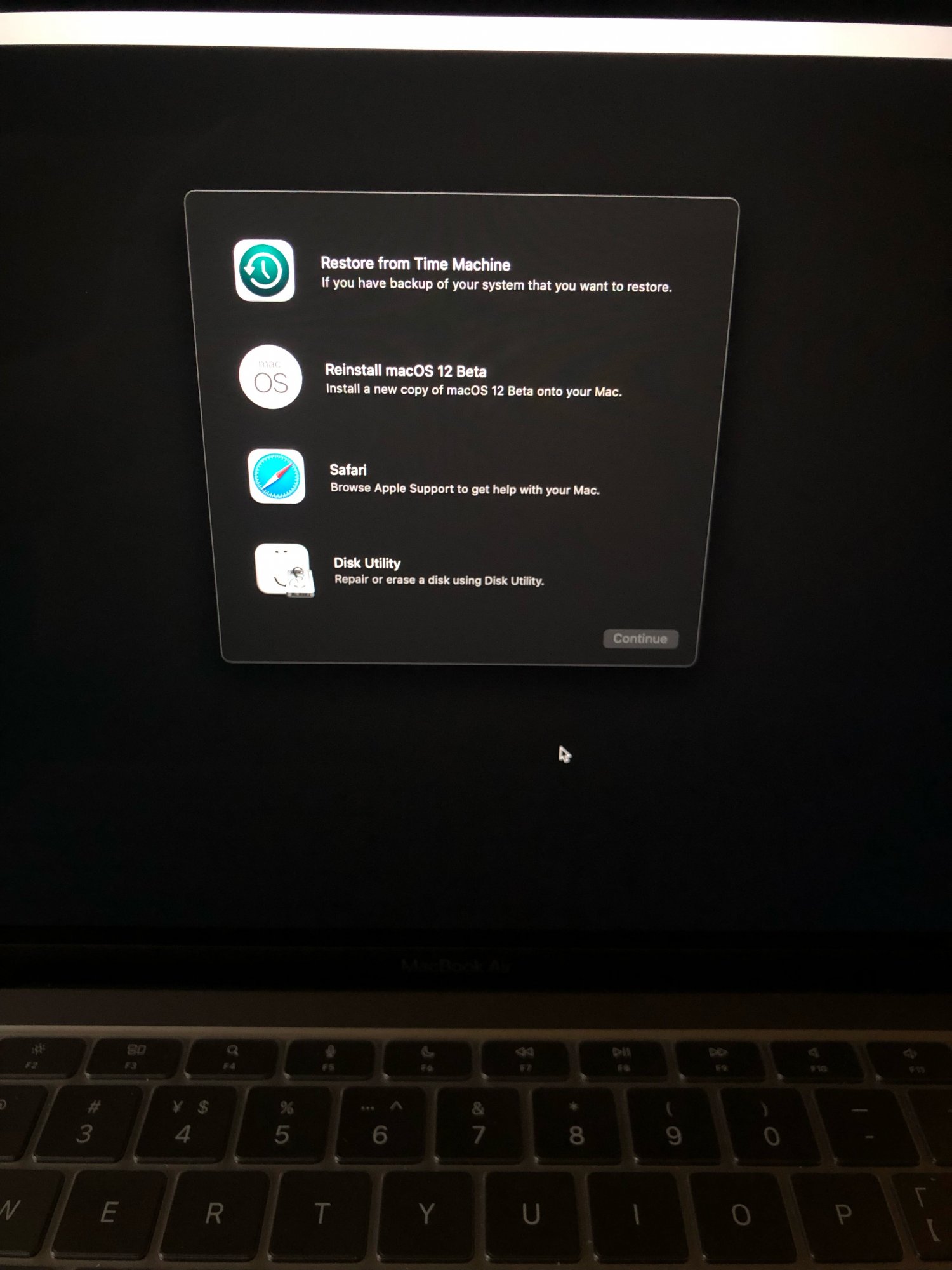 如图 进入系统恢复后,安装那一项成了安装 Macos 12.0 了 怎么才能把它降回去 我看了下磁盘工具里不能抹掉,原本抹掉 macintosh hd 的时候有个抹掉全部分区组的那个选项也没有了。